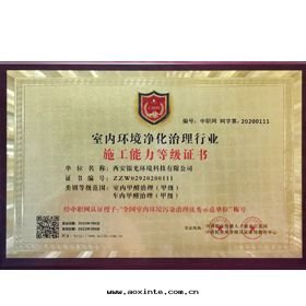 室(shì)內(nèi)(車內(nèi))环(huán)境淨化(huà)治理(lǐ)服務(wù)施工能(néng)力甲級證書(shū)